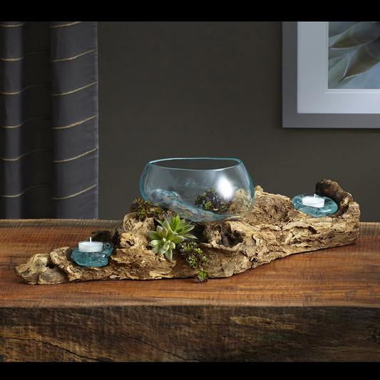 Open Mouth Molten Glass Bowl on Gamal Root Base with Candleholders